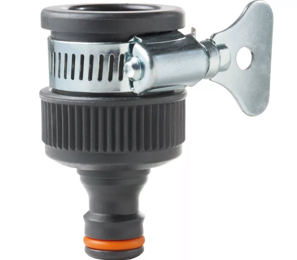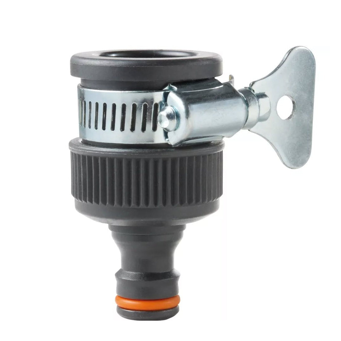 Um die Schnellkupplung an Wasserhähnen ohne Gewinde anzuschließen. Mit Metallschelle und mit Schmetterlingsschlüssel für sichere Anwendungen.